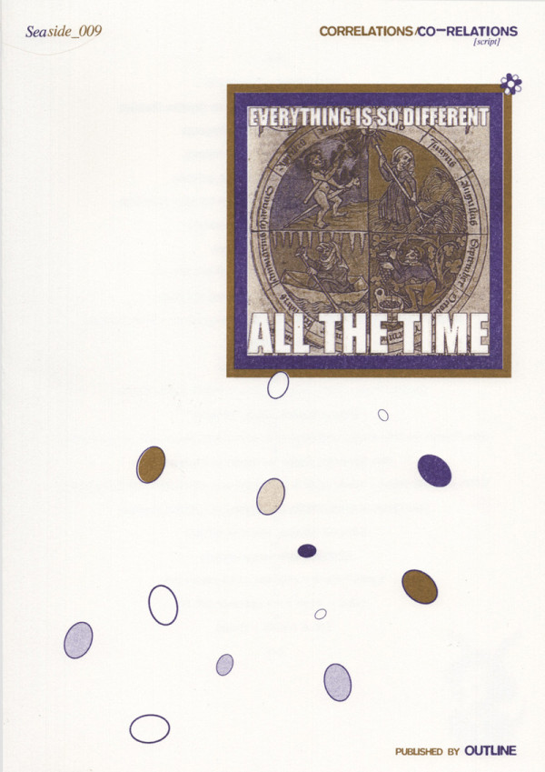 Seaside_009: Correlations/co-relations: was read and listened to collectively during a gathering on 13 October 2023 during BYOB Art Book Fair at Enter Enter in Amsterdam. This loosely connected patchwork of bootlegged texts and collected sounds all deal with notions of the archive and the remix in some way or another. Together they form a soft proposal for a publishing practice based around dubbing, multivocality and “speaking nearby”.