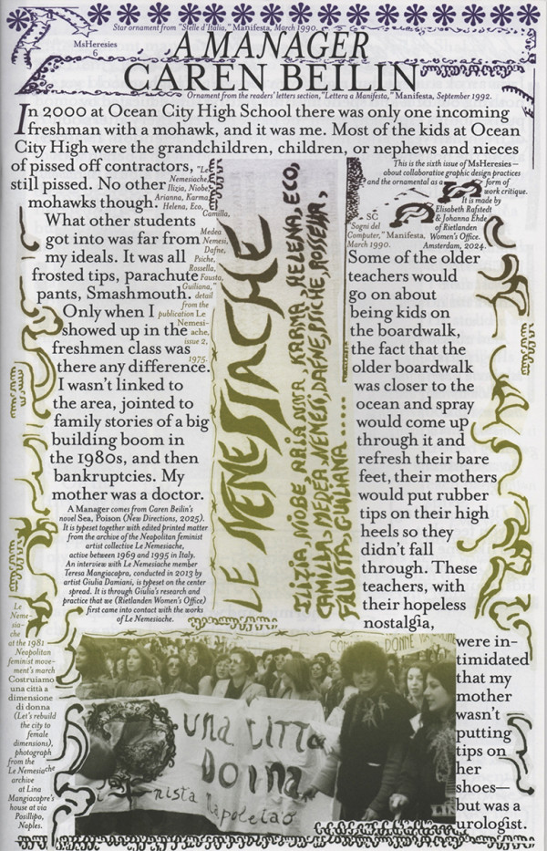 MsHeresies 6 — A Manager republishes an edited chapter from Caren Beilin. It is typeset together with reworked material from the archive of the Neapolitan feminist artist collective Le Nemesiache, active between 1969 and 1995.
