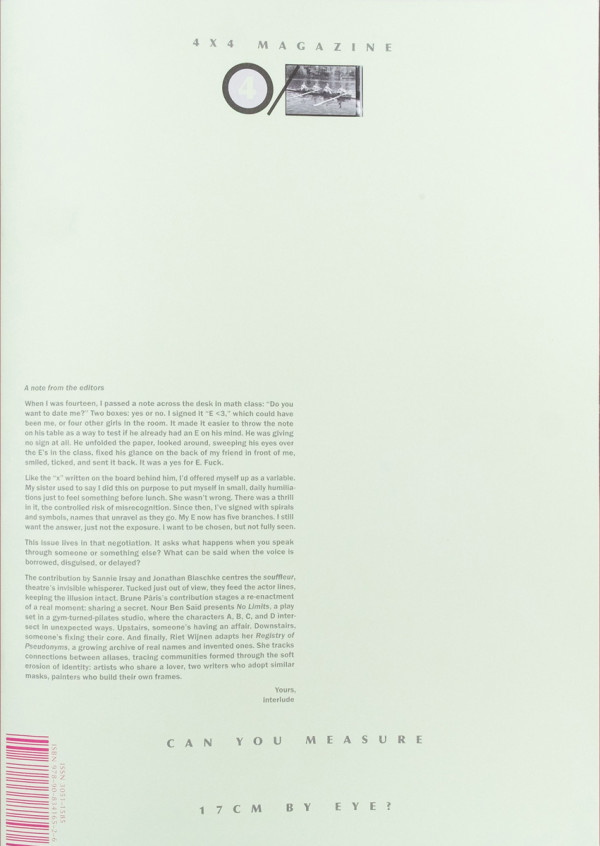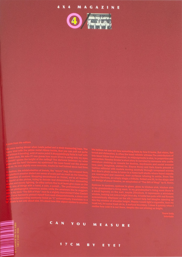 4/4 is a quarterly magazine that brings together 4 contributions from authors, writers, and designers in each issue. Like a roundtable dialog, these works subtly interact, complement, or contrast with one another, shaping a theme that lingers in the background, emerging without prior knowledge or intent. 4 corners of one sheet. 4 slices of a pie.