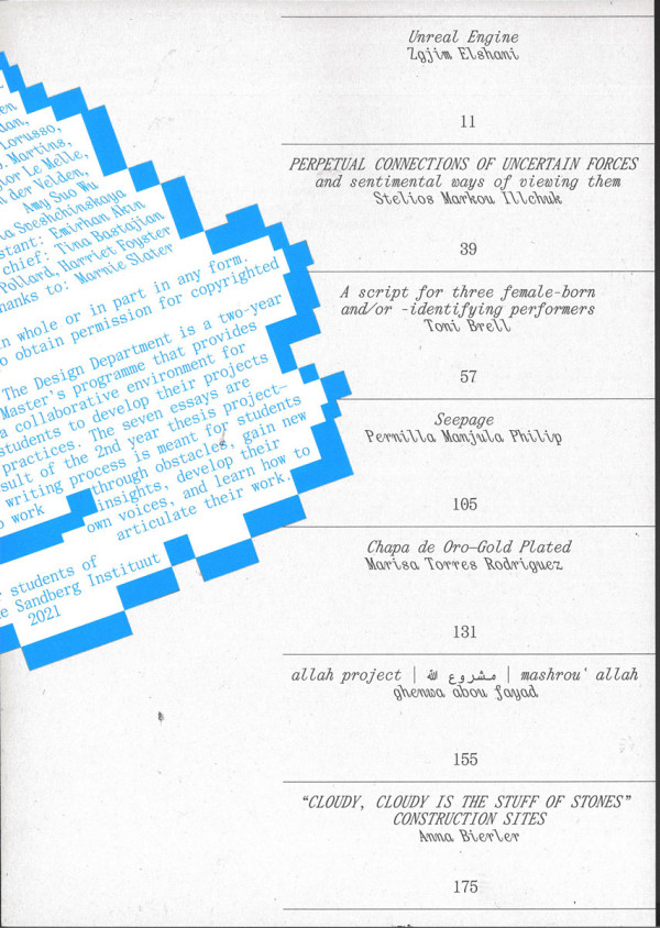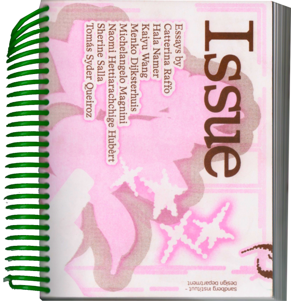 Issue is a printed publication self-published by Sandberg Institute's Design Department. Each issue contains essays written by second year students and is designed by first year students.