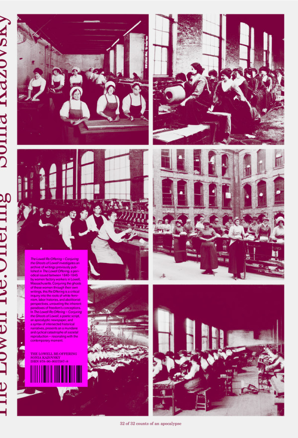 A poetic script, an apocalyptic newspaper, and a syntax of intersected historical narratives. An investigation of an archive of writings previously published in The Lowell Offering, a periodical issued between 1840-1845 by women factory workers in Lowell, Massachusetts.