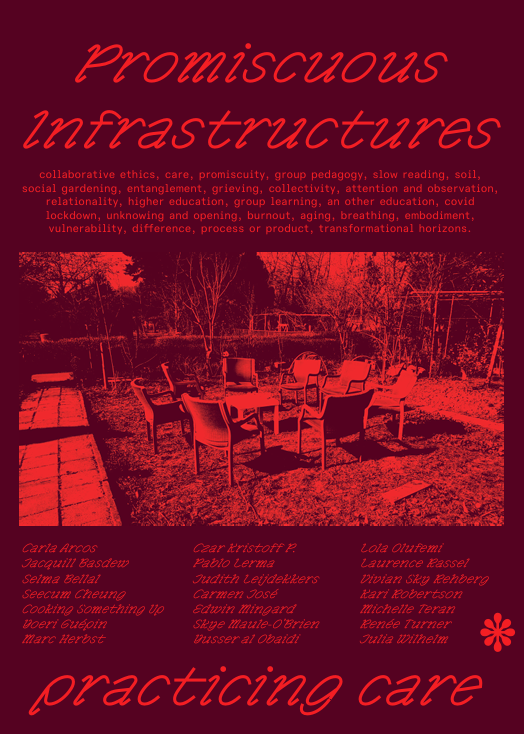 The manual Promiscuous Infrastructures Practicing Care calls for an ethics of care and attentiveness to one another, re-imagines the making and the use of infrastructures, and situates care within a genealogy of artistic and social practice.